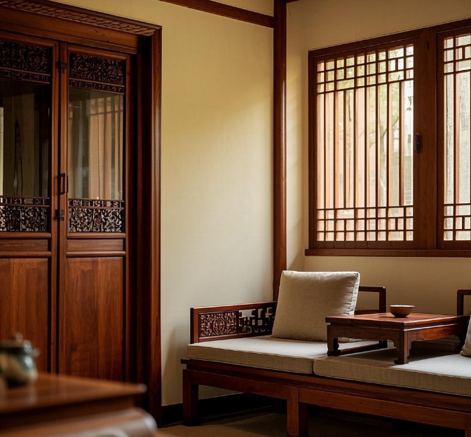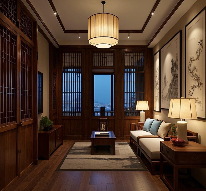 书房之中,更是古韵悠长。博古架上陈列着古籍善本、瓷器古玩,展示着主人的文化底蕴与高雅志趣。一张宽大的中式书桌置于窗前,笔墨纸砚摆放有序,阳光透过白色的窗纱,斑驳地洒在桌面,邀请人在此挥毫泼墨、书写诗意人生。太师椅上的锦缎坐垫,绣着淡雅的梅兰竹菊图案,人坐下时,仿佛能与古代文人雅士并肩,沉浸在书海墨香之中。